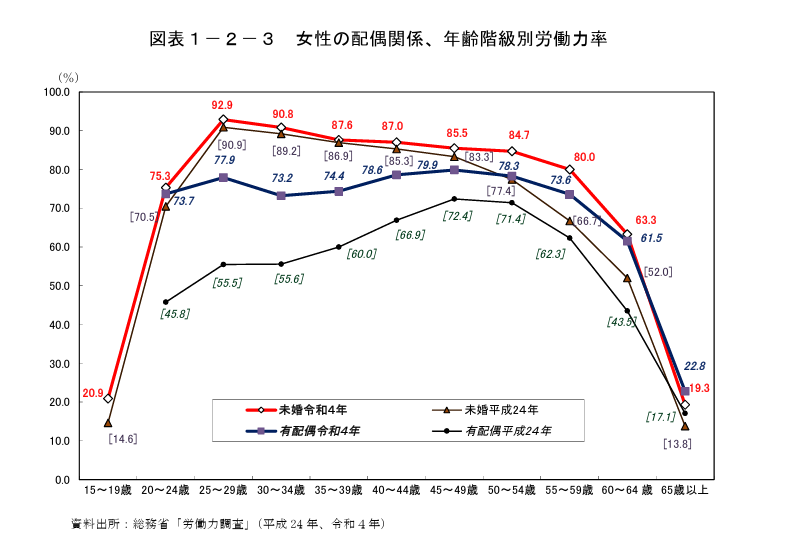 また配偶関係別に令和4年の女性の労働力率をみると、未婚者は67.6%、有配偶者は57.2%、死別・離別者は 31.5%となっている。 年齢階級別に未婚又は有配偶者女性の労働力率をみると、未婚者では「25~29歳」(92.9%)が最も高い。 一方、有配偶者は、「45~49歳」(79.9%)が最も高く、前年に比べ、「65歳以上」を除く年齢階級において労働力率は上昇している。10年前の平成24年と比較すると、全ての年齢階級で労働力率は上昇しており、上昇幅が最も大きいのは「20~24歳」(27.9 ポイント上昇)であった。女性の年齢階級別労働力率の底である「35~39 歳」も14.4ポイント上昇している。 (図表1-2-3)