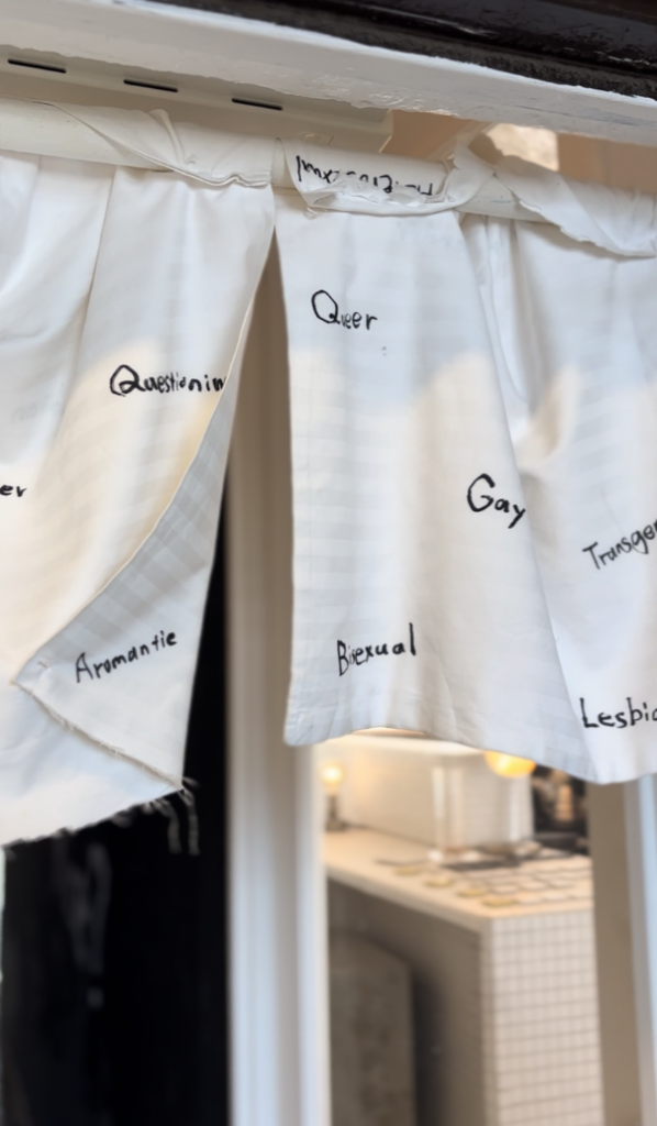 銭湯の内装にインスピレーションを受けた当カフェは、入口に全てのセクシャリティを受け入れることを示した小さな暖簾を設置しています。自分以外のセクシャリティや性自認の方が、この世界にはいることを改めて認識しご入店頂けると幸いです。