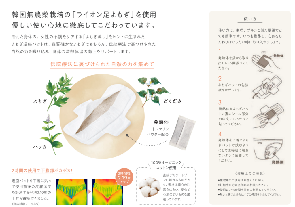 約600年前から韓国に伝わる伝統療法“よもぎ蒸し”から着想を得た知恵を、ナプキン型という手軽な形状にギュッと詰め込んでいます。