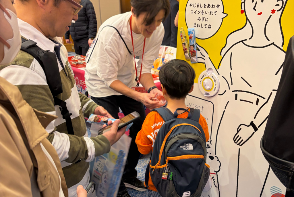 特に人気だったのはLy:setオリジナルのガチャガチャ。子どもたちが目を輝かせてコインを入れる様子がとても微笑ましく、子育て世代に嬉しいプレゼントがたくさん当たりました。ガチャガチャをきっかけに、隣に設置した「スムーズフリー・生酵素PREMIUM111」のサンプルにも自然と目を向けていただけました。