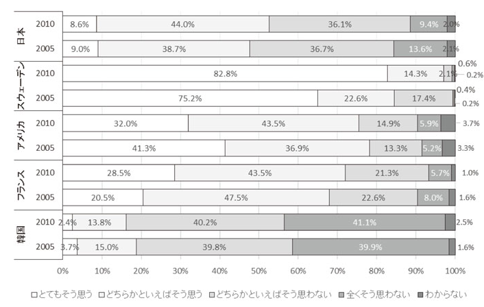 少子化社会に関する国際的な意識調査によれば、「あなたの国は、子どもを産み育てやすい国だと思いますか」の質問に対して、日本では4割以上が「そう思わない」と回答。