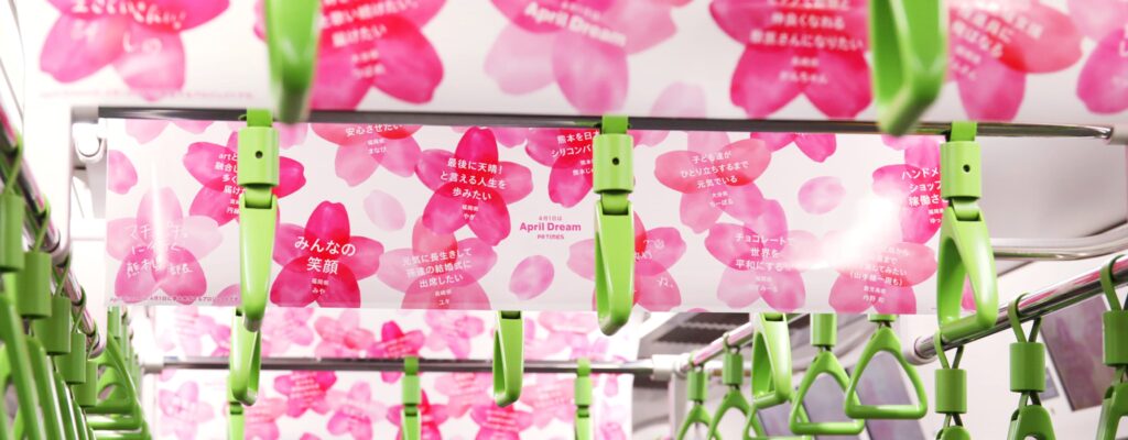 これまでApril Dreamプロジェクトに応募いただいた皆様の夢は、桜の花に載せ山手線をはじめ47都道府県に掲出中です!