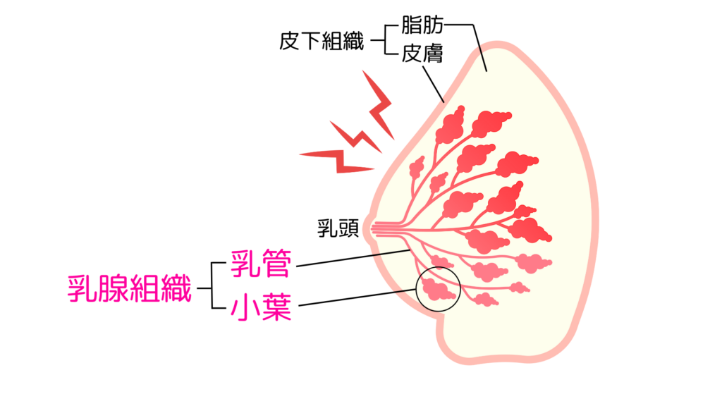 乳房は皮膚、脂肪などの皮下組織、乳腺組織から成り立っています。乳腺は母乳をつくり、乳幼児への栄養や免疫機能を与えるための重要な組織です。乳頭を中心に乳腺が放射状に15~20個並んでいます。それぞれの乳腺は小葉に分かれ、小葉は乳管という管(くだ)でつながっています。