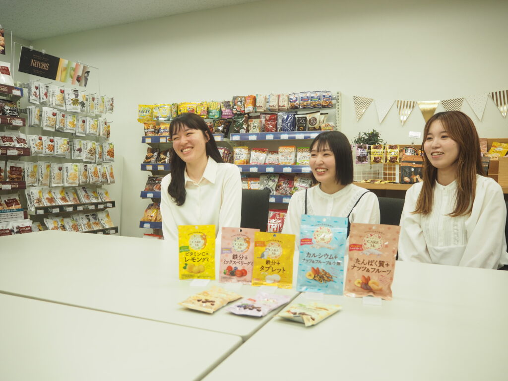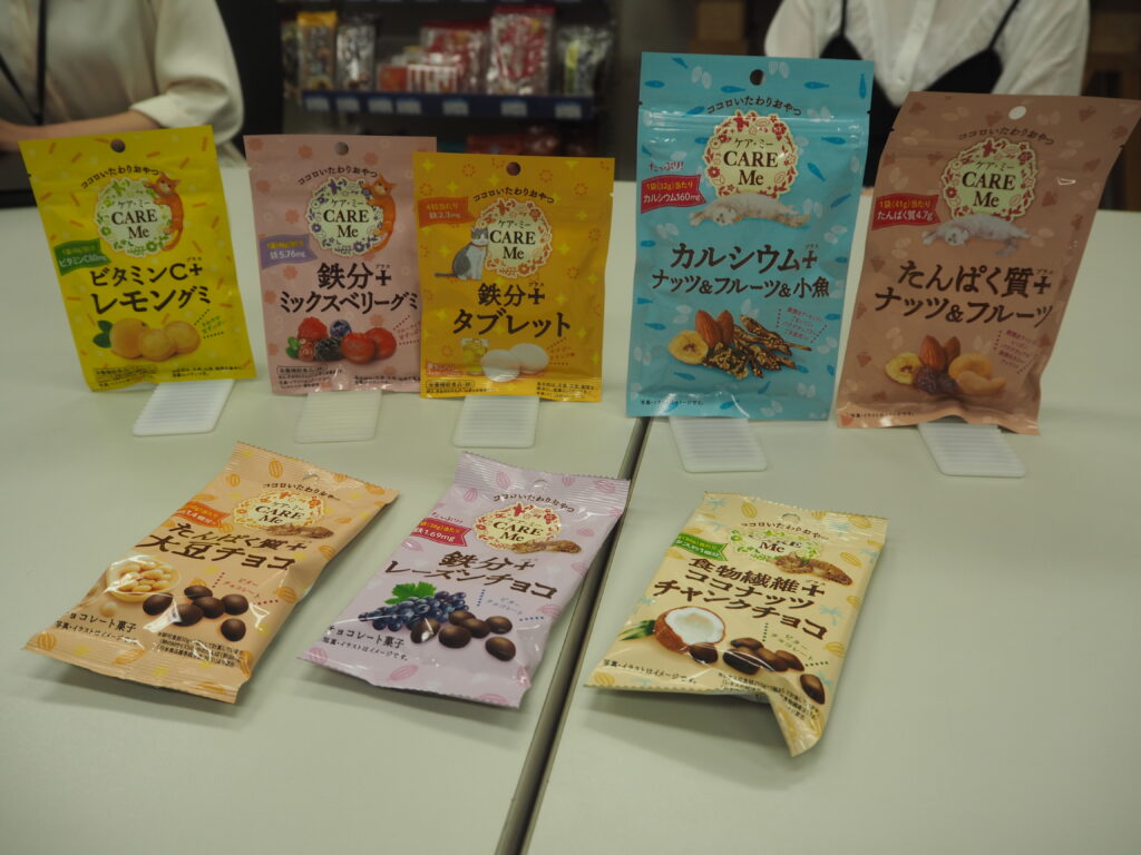 お菓子の企画開発などを行ってきた弊社ですが、これまでこども・ファミリー、シニア向けの商品は開発の経験はありましたが、お菓子の商品企画・開発・輸入を行っている子会社クリート株式会社もマーケティング部もほとんどが女性で構成されているものの「女性の健康」をターゲットに焦点を当てた商品や企画などは実施していませんでした。展示会やネットで目にする機会が増えた「フェムケア」が話題に上がり、マーケティング部とクリート合同の女性社員たちでお菓子でできることはないかと話し合ったのがきっかけで生まれたのが、『CARE Me(ケア・ミー)』シリーズです。