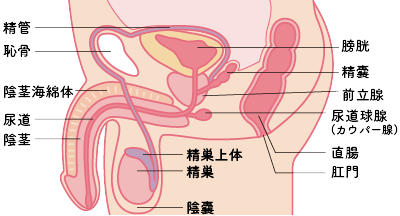 まずは、射精するときの精子の通り道についてお話しします。精子は精巣の中にある精細管というところで作られます。作られた精子は精巣上体という管の中に蓄えられています。