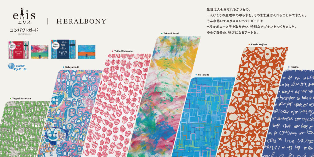 生理用品ブランド「エリス」は 1985 年に誕生し、2022 年、ブランドメッセージを「だれかではなく、あなたのそばに。」として、ひとりひとりに寄り添うブランドに刷新されました。もともと素肌のきもち コンパクトガードという商品は、バリキャリの女性をターゲットに、オフィスでもスマートに持ち歩け、経血の吸収力も長時間のデスクワークにも対応した漏れない仕様になっていましたが、コロナ禍を経て様々な働き方、生活の仕方、個性をお持ちの方、それぞれに寄り添っていきたいという想いで、エリスならではの痒い所に手が届く商品でありたいとリブランディングしました。持ち歩く際の恥ずかしさを払拭し、持ち歩きたい!と思えるようなナプキンを目指し、生理の時のブルーな気持ちが晴れ、ナプキンひとつひとつの柄を見ても気分があがるような、個々が好きな柄が選べるように♯meetmyelisをキーワードに、ナプキンらしくないアメニティのようなデザインを採用。「ヘラルボニー」は、国内外の主に知的障害のある作家とアートライセンス契約を結び、2,000点を超えるアートデータを軸に作品をプロダクト化し、障害のイメージを変えることにチャレンジしている会社。ひとりひとりのありのままの姿が社会の中でリスペクトされていくことを目指し、「障害」という言葉が持つ価値観のアップデートに日々取り組んでいます。そんなヘラルボニーとのコラボレーションで生まれた「エリス コンパクトガード ヘラルボニー企画品」は2024年6月に数量限定デザインとして発売しました。一人ひとり異なる生理のゆらぎを、そのまま受け入れることができるよう「ひとりひとりのありのまま」に寄り添える商品でありたいと生まれたナプキンです。