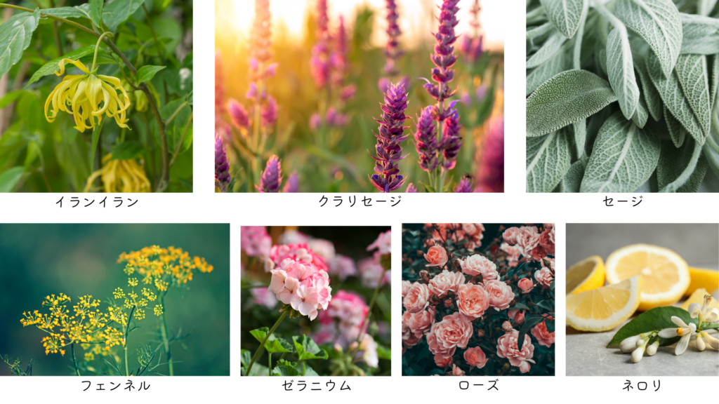 イランイラン、クラリーセージ、セージ、フェンネル、ゼラニウム、ローズ、ネロリ